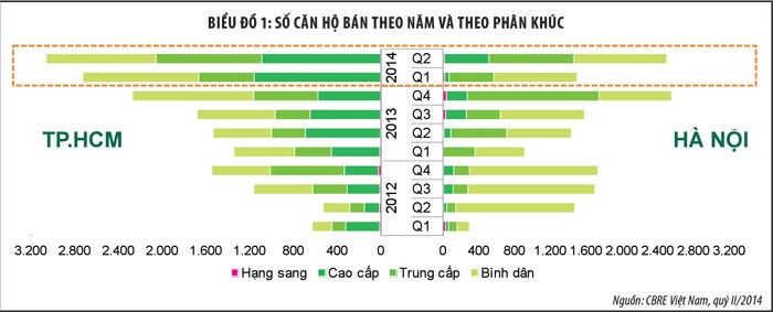 Trên thị trường nhà ở, trong nửa đầu năm nay, các hoạt động mở bán và tiếp thị diễn ra nhộn nhịp ở tất cả các phân khúc. Nếu như trong quý I/2014, các chủ đầu tư còn khá dè dặt trong việc mở bán căn hộ mới và chủ yếu triển khai bán các căn đã chào trước đó, thì đến quý II/2014, số căn hộ mở bán mới trên thị trường đã nhiều hơn, do các chủ đầu tư dường như đã tự tin hơn vào diễn biến thị trường.