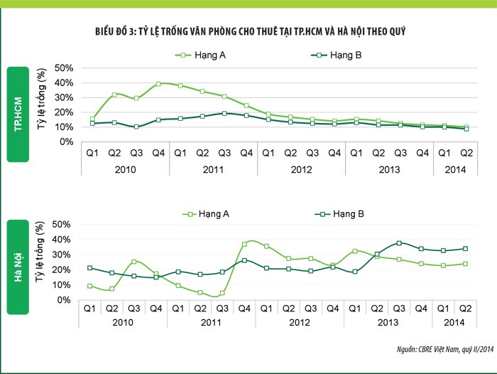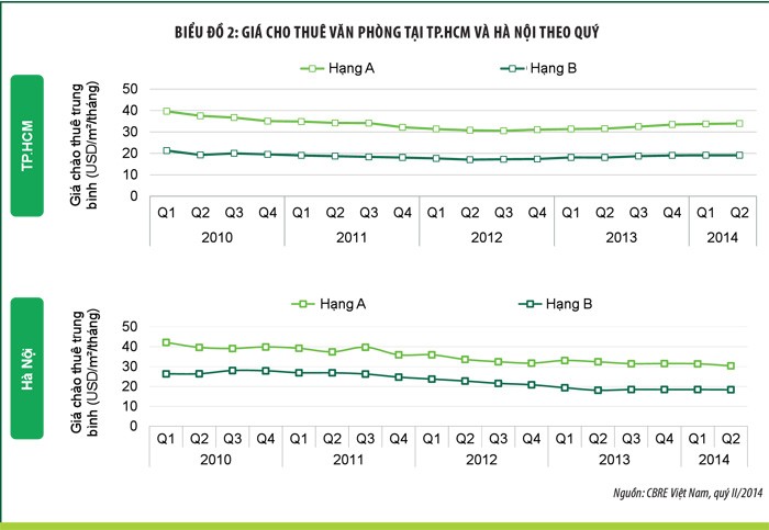 Thị trường văn phòng trong quý II/2014 cho thấy diễn biến trái ngược tại hai thành phố Hà Nội và TP.HCM. Trong khi thị trường TP.HCM có chút cải thiện về giá thuê trung bình và tỷ lệ lấp đầy so với quý trước và có sự tăng trưởng đáng kể so với cùng kỳ năm trước, thì bức tranh ở Hà Nội không được lạc quan, khi giá thuê trung bình và tỷ lệ lấp đầy đều giảm so với quý trước ở cả tòa nhà hạng A và hạng B.