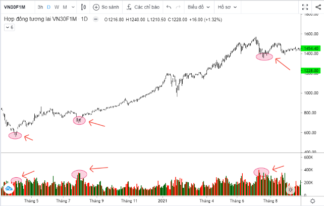 Hiện có 1 tín hiệu kỹ thuật đáng tin cậy từ diễn biến của thị trường chứng khoán phái sinh theo giá và khối lượng giao dịch: Trong diễn biến thị trường giảm điểm, kết hợp với đó là sự chán nản của nhà đầu tư, thời điểm Khối lượng giao dịch tại thị trường phái sinh tăng đột biến và cao hơn lịch sử thì thị trường cho tín hiệu tạo đáy ngắn hạn.