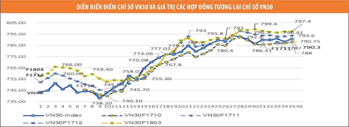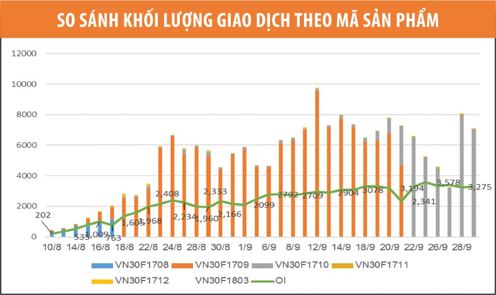 Thanh khoản thị trường tập trung vào các hợp đồng ngắn hạn, phù hợp với thông lệ quốc tế. Khối lượng mở (OI) toàn thị trường nhìn chung duy trì xu hướng tăng. Tính đến cuối ngày 29/9/2017, khối lượng OI của toàn thị trường tăng 51,2% so với cuối tháng 8, đạt 3.275 hợp đồng với OI của các hợp đồng VN30F1710, VN30F1711, VN30F1712 và VN30F1803 lần lượt là 2.843 hợp đồng, 62 hợp đồng, 153 hợp đồng và 217 hợp đồng.