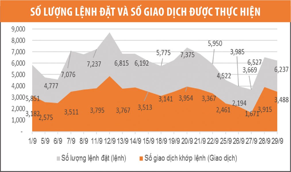 Số lượng lệnh vào hệ thống trong tháng 9 tăng 91,3% so với tháng 8; trong tháng có 121.991 lệnh của nhà đầu tư được đưa vào hệ thống, tính bình quân có 6.100 lệnh/ngày, trong đó tổng cộng 66.692 giao dịch được thực hiện, chiếm 54,7% lượng lệnh đặt. Đặc biệt, phiên giao dịch ngày 12/9 có 9.817 hợp đồng, khối lượng giao dịch cao nhất từ khi khai trương thị trường (ngày 10/8) đến nay, tương ứng giá trị giao dịch 756,27 tỷ đồng.