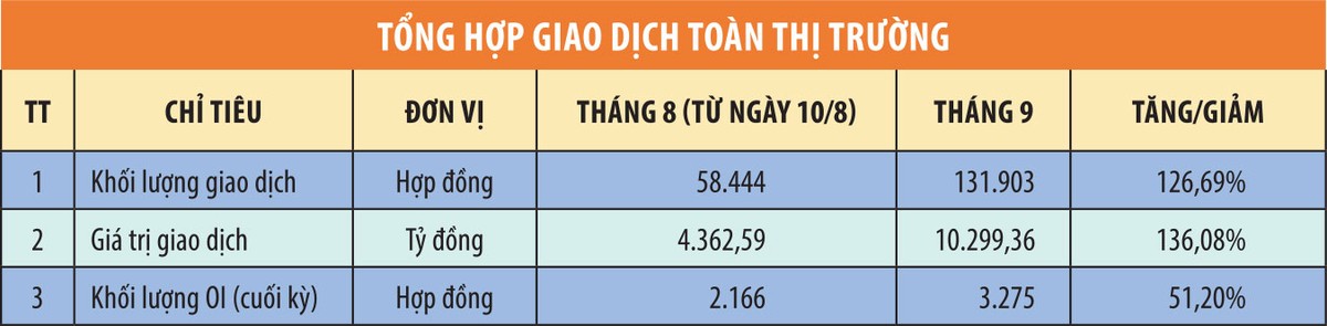 Tổng khối lượng hợp đồng giao dịch trong tháng 9 là 131.903 hợp đồng, tương ứng giá trị giao dịch (theo quy mô danh nghĩa hợp đồng) đạt 10.300 tỷ đồng, tăng 126,7% về khối lượng và 136% về giá trị giao dịch so với tháng 8. Tính bình quân, khối lượng giao dịch đạt 6.595 hợp đồng/phiên, giá trị giao dịch bình quân theo quy mô danh nghĩa đạt 514,96 tỷ đồng/phiên, gấp 1,9 lần so với tháng 8.