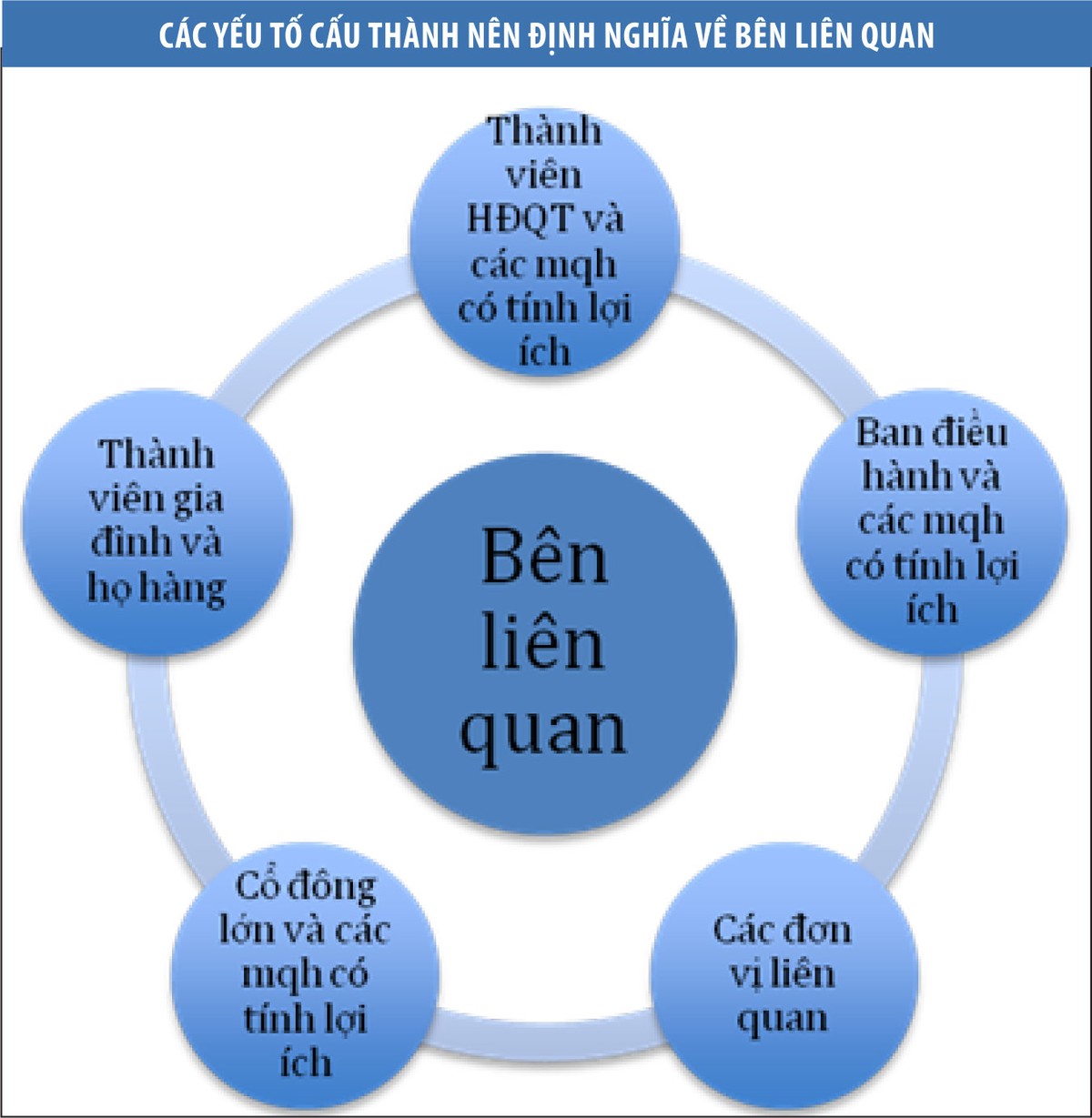 Ở Việt Nam, Luật Doanh nghiệp 2014 có sửa đổi về khái niệm về bên liên quan so với Luật Doanh nghiệp cũ. Khái niệm này không đồng nhất với khái niệm về bên liên quan được nêu trong Luật Các tổ chức tín dụng, nhưng nó bao gồm nhiều thành phần hơn, chẳng hạn như định nghĩa về các thành viên trong gia đình là rộng hơn và định nghĩa về người quản lý của doanh nghiệp là toàn diện hơn. Ngoài ra, khái niệm nêu tại Luật Các tổ chức tín dụng không nhất quán với khái niệm bên liên quan trong Chuẩn mực Kế toán Việt Nam số 26 (VAS 26) về công bố thông tin bên liên quan.