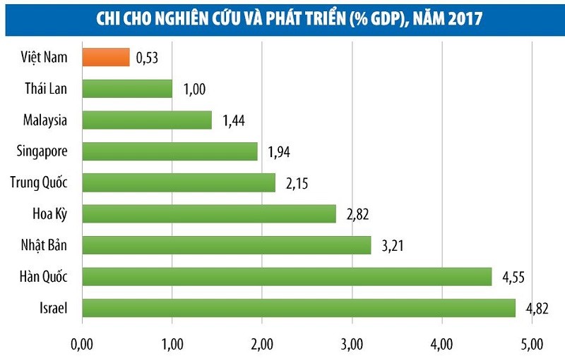 Ngược lại với giáo dục, chi ngân sách nhà nước cho khoa học và công nghệ dù tăng nhanh qua các năm, nhưng hiện chỉ chiếm 2% tổng chi ngân sách. Tính chung, tổng chi đầu tư xã hội cho khoa học, công nghệ ước đạt khoảng 1,3% GDP. Chi tiêu nghiên cứu và phát triển của Việt Nam chỉ khoảng 0,5% GDP, trong khi bình quân thế giới là 2,2% GDP, Thái Lan là 1,0%, Singapore là 1,94%, Malaysia 1,44%, Trung Quốc 2,2%, Hàn Quốc lên đến 4,6%, Nhật Bản 3,2%, bình quân các nước EU là 2%. Thế nhưng, điều đáng bận tâm là phần lớn ngân sách chi cho khoa học, công nghệ dành để nuôi bộ máy, thực chi cho đề tài hiệu quả còn ít.