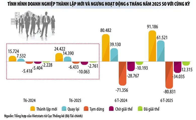 Đáng chú ý, làn sóng doanh nghiệp gia nhập thị trường diễn ra mạnh mẽ với gần 91.200 doanh nghiệp thành lập mới (tăng 11,8%) và 61.500 doanh nghiệp quay lại hoạt động (tăng đến 57,2%), nâng tổng số doanh nghiệp tham gia thị trường lên hơn 152.700 trong nửa đầu năm (tăng 26,5%).