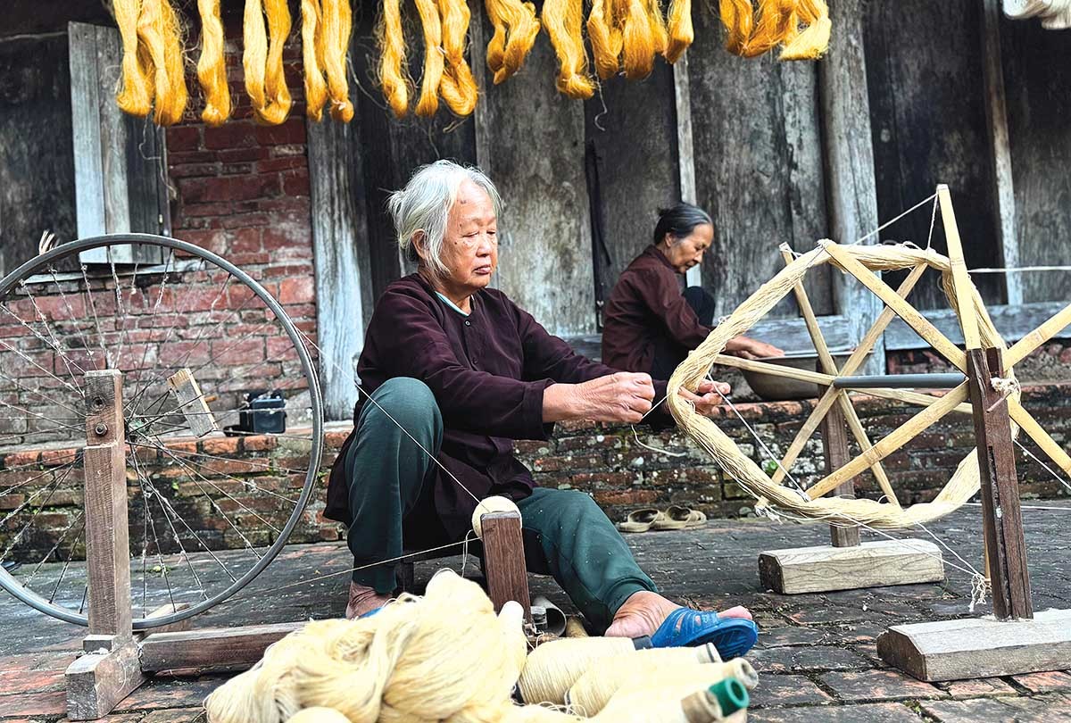 Trong hành trình ấy, những nghệ nhân cao tuổi trở thành trụ cột tinh thần của làng nghề. Đơn cử, cụ Phạm Thị Hồng, 96 tuổi, vẫn đều đặn ngồi kéo đũi dưới mái hiên cũ. Đôi tay in hằn dấu vết thời gian, có lúc run run, nhưng từng động tác vẫn thuần thục. Mỗi sợi đũi cụ kéo ra là một mảnh ký ức sống động của làng nghề, là minh chứng cho một kỹ năng mà sách vở khó có thể ghi chép đầy đủ.