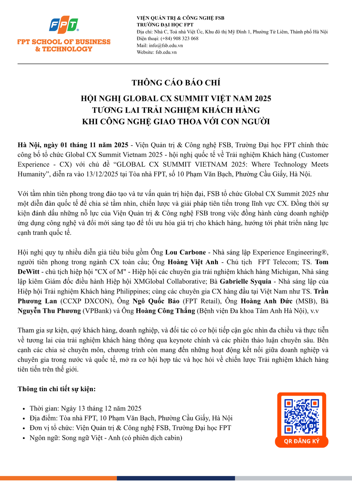 Viện Quản trị & Công nghệ FSB, trường Đại học FPT chính thức công bố tổ chức Hội nghị Global CX Summit 2025 - hội nghị Trải nghiệm Khách hàng thường niên quốc tế, diễn ra vào 13/12/2025 tại Tòa nhà FPT Hà Nội.