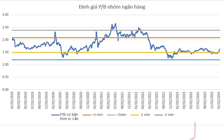 Xét về mặt bằng định giá, với mức P/B bình quân đóng cửa phiên 12/01/2024 là khoảng 1,62 lần, có thể nói nhóm ngân hàng vẫn đang tương hấp dẫn khi so sánh với bình quân vùng lịch sử 5 năm gần nhất là khoảng 1,79 lần nên cơ hội cho nhà đầu tư nhóm ngân hàng trong trung hạn là vẫn còn. Tuy nhiên, hiện tại sẽ cần chờ đợi thêm để nhịp chỉnh của nhóm ngân hàng mở rộng để có vị thế giải ngân an toàn hơn.