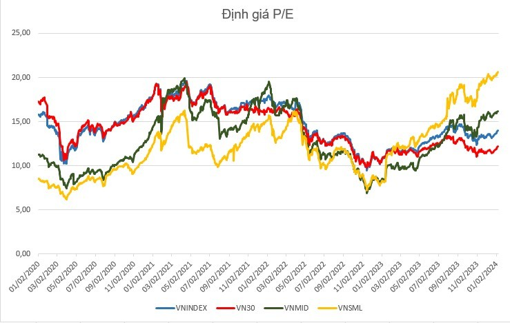 Chúng tôi cho rằng nhóm Midcap và smallcap bị điều chỉnh ở thời điểm hiện tại là nhịp nghỉ phù hợp bởi các dòng này đã tăng tương đối mạnh trong giai đoạn trước đó. Điều này trái ngược lại với nhóm vốn hóa lớn đại diện bởi chỉ số VN30 có hiệu suất kém hơn thị trường chung khi mà nhóm ngân hàng và các cổ phiếu thuộc nhóm Vingroup đã có mức giảm tương đối trong nửa cuối năm 2023.