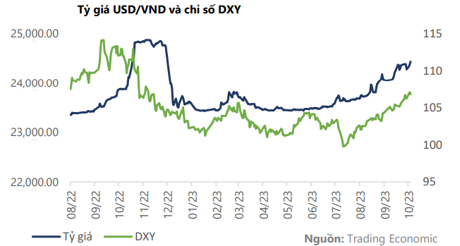 Tháng 9, tỷ giá USD/VND đạt 24.340 (+1,2% so với tháng trước); giá trị tiền đồng tiếp tục mất giá dưới áp lực xu hướng hồi phục nhanh của sức mạnh đồng bạc xanh. Chỉ số DXY đạt 104,9 (+2% so với tháng trước). Tiếp tục bị ảnh hưởng bởi chính sách điều hành trái ngược giữa Việt Nam và thế giới kể từ thời điểm quý II năm nay.