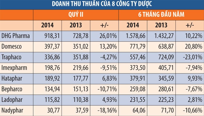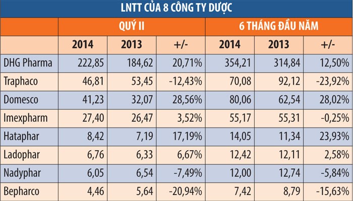 Về chỉ tiêu lợi nhuận, 8 doanh nghiệp dược này lãi trước thuế tổng cộng 364 tỷ đồng trong quý II/2014, tăng 13% so với cùng kỳ năm trước; tính chung 6 tháng đầu năm, lãi 605 tỷ đồng, tăng 6,25%.