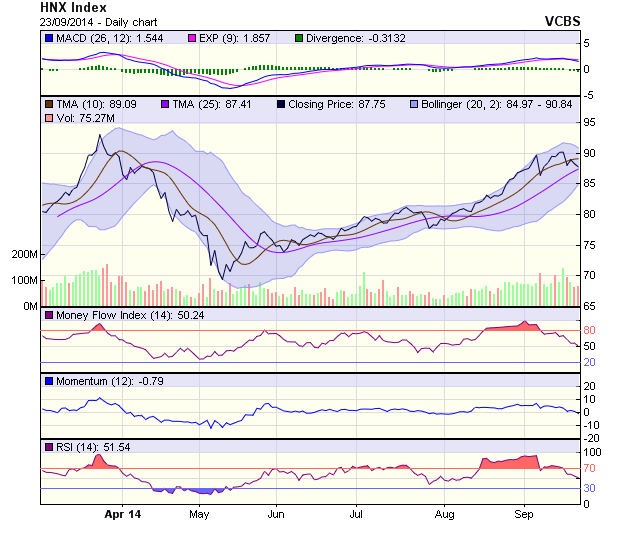 Thị trường chưa có nhiều sự thay đổi rõ rệt, đóng cửa phiên 23/9, HNX-Index giảm nhẹ 0,48 điểm về 87,75 điểm. Chủ yếu đường giá dao động trong biên độ hẹp với thanh khoản tiếp tục có phần sụt giảm tính từ 1 tuần trở lại đây.