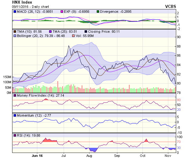 HNX-Index giảm điểm mạnh trong phiên và hồi phục về cuối phiên, tạo nên một nến chân dài, khả năng sideway trong phiên 10/11 có thể xảy ra. Tín hiệu trong ngắn hạn chuyển sang tiêu cực, với kháng cự trong khoảng 80,7-81,5 điểm (MA5-10). Xu hướng trong trung hạn là tiêu cực, với kháng cự trong khoảng 82,9- 83,9 điểm (MA20-50-100). Thị trường con gấu (bear market) tiếp tục được củng cố với kháng cự tại MA200 ở mức 82 điểm. Dự đoán xu hướng trong phiên 10/11, HNX-Index có thể giảm điểm vào đầu phiên, sau đó hồi phục cuối phiên.