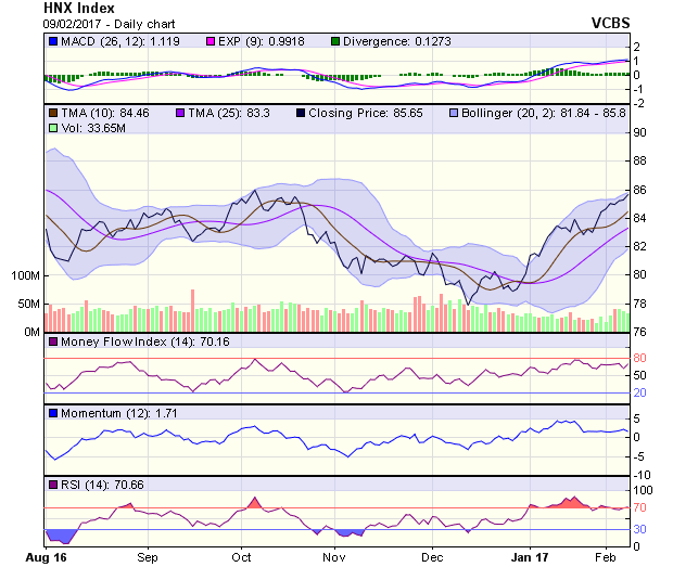 HNX-Index tăng điểm phiên thứ 2 liên tiếp. Tín hiệu kỹ thuật trong ngắn hạn tiếp tục tích cực, với vùng hỗ trợ trong khoảng 84,5-85,2 điểm (MA5-10) và kháng cự gần nhất tại 85,9 điểm (đỉnh phiên 7/2). Tín hiệu kỹ thuật trung hạn ở mức tích cực, với hỗ trợ gần nhất tại 83,8 điểm (MA20).