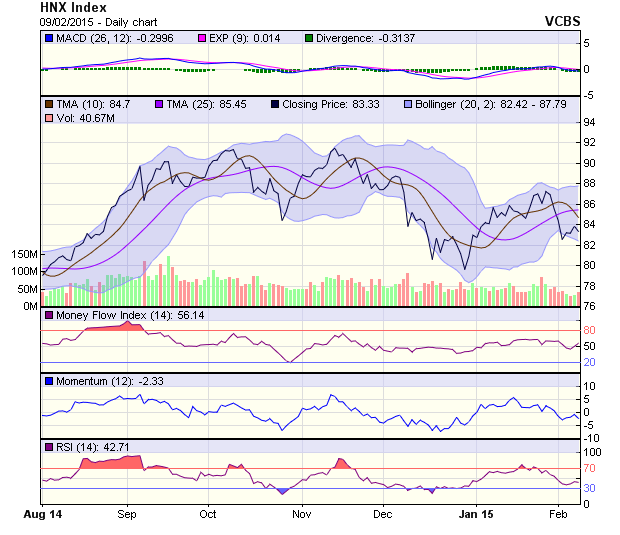 Đồ thị HNX-Index tạo thành 1 black candlestick, phản ứng với đường kháng cự tạo bởi SMA50. Xu hướng tích cực vẫn tiếp tục được duy trì khi chỉ số này vẫn đang nằm trên đường SMA200. Các chỉ báo kỹ thuật chưa cho dấu hiệu yếu đi đối với xu hướng hồi phục tăng điểm trong ngắn hạn.