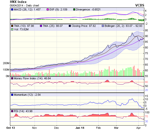 Ngắn hạn, HNX-Index đang hình thành giai đoạn tích lũy và phân hóa ngắn hạn khi bám sát đướng SMA 20 và giao dịch với biên độ hẹp. Thời điểm công bố thông kết quả hoạt động kinh doanh quý 1/2014 đang đến gần sẽ làm sự phân hóa trong nhóm cổ phiếu đầu cơ diễn ra mạnh hơn, khi dòng tiền đầu cơ ngắn hạn vẫn còn dồi dào nhưng chọn lọc và thận trọng hơn rất nhiều so với thời gian trước.