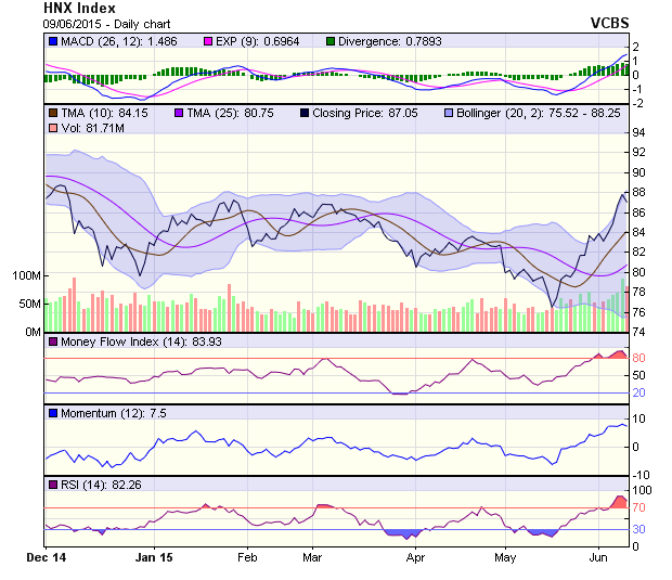 Đồ thị chỉ số HNX-Index sau khi test không thành công mốc 88 điểm đã lùi về mốc đỉnh cũ 87.2 điểm. Khả năng chỉ số này sẽ test lại vùng hỗ trợ 85.3 – 86 điểm. Các ngưỡng kháng cự mạnh chưa bị phá vỡ, tuy vậy rủi ro điều chỉnh ngắn hạn đang diễn ra khi các chỉ báo kỹ thuật có xu hướng suy yếu tại vùng quá mua.