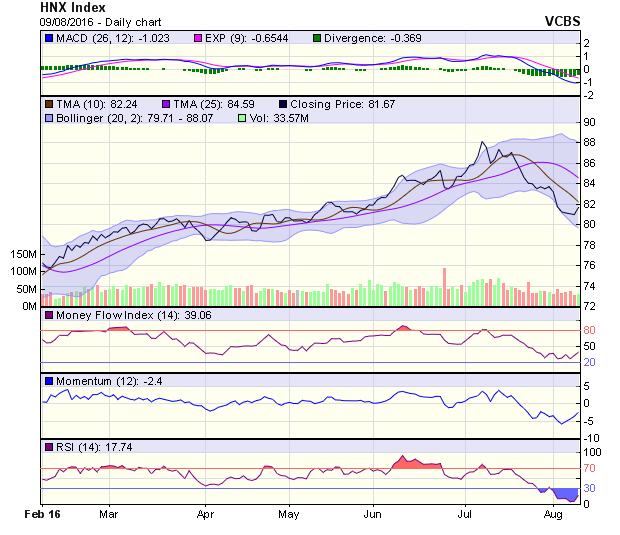 HNX-Index hình thành cây nến xanh marubozu, bóng nến dưới ngắn, lực cầu cho tín hiệu tích cực trở lại. Thanh khoản tuy vậy vẫn giữ ở mức thấp. RSI cho tín hiệu có khả năng cắt lên đường 30, MACD cho tín hiệu tích cực dưới đường 0. Vùng hỗ trợ 80 điểm. Vùng kháng cự 82 điểm.