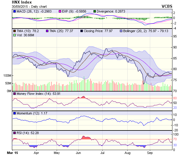 VN-Index bật tăng trở lại từ mốc hỗ trợ 560 điểm, lấp đầy Falling Window của phiên ngày 29/9 giúp áp lực điều chỉnh sâu của chỉ số này phần nào giảm bớt. Tuy nhiên, giao dịch tiếp tục duy trì ở mức thấp, chỉ số hình thành Doji ngay bên dưới đường SMA20 cho thấy khả năng bứt phá chưa cao. Chỉ báo RSI bật tăng trở lại từ mốc 30 hỗ trợ cho xu hướng tăng trong ngắn hạn của chỉ số này.