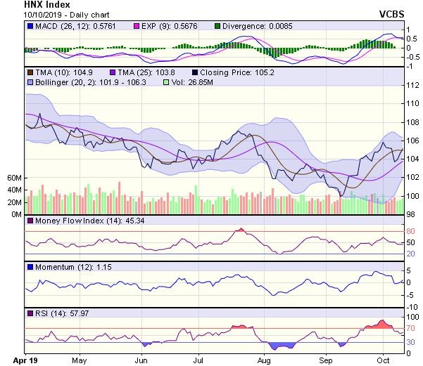 HNX-Index vẫn duy trì được tín hiệu tích cực. Chỉ số có phiên tăng điểm thứ ba liên tiếp vượt ngưỡng 104.8 điểm (MA200) và duy trì đóng cửa trên MA20, kèm khối lượng gia tăng, cho thấy chỉ số có thể vẫn giữ được xu hướng phục hồi ngắn hạn.