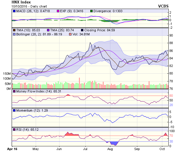Dự báo xu hướng của HNX-Index trong phiên 11/10 có thể là lui về kiểm tra mốc hỗ trợ 84 điểm, nếu mốc này được giữ vững, chỉ số sẽ tiếp tục dao động trong vùng 84- 85 điểm.
