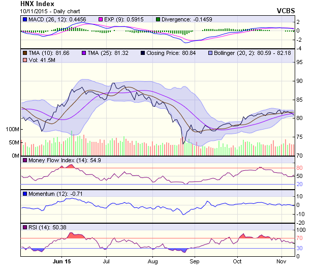 HNX-Index tiếp tục trạng thái điều chỉnh giảm trong biên độ hẹp phiên thứ 3 liên tiếp. Chỉ số này đã giảm xuống dưới đường SMA20 và lùi về sát mốc hỗ trợ 80.7 điểm. Nếu tiếp tục suy giảm, xu hướng đi ngang trong hơn 1 tháng qua sẽ chấm dứt và HN-Index sẽ hướng tới vùng 79-79.4 điểm trong ngắn hạn. RSI suy yếu về mốc 50 trong khi Band%B tiếp tục giảm sát về mốc 0 cho thấy xung lực giảm đang có xu hướng tăng dần.