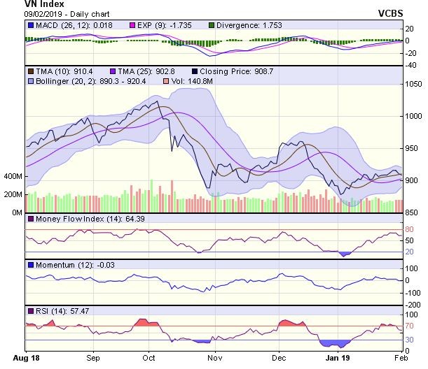 Dự báo, trong tuần giao dịch đầu tiên của năm Kỷ Hợi (11/2-15/2), tâm lý hứng khởi của nhà đầu tư có thể giúp VN-Index thử thách lại vùng kháng cự 915-920 điểm (MA10 tuần-MA50 ngày).