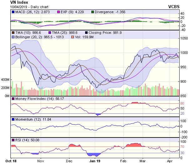Điều này cho thấy thị trường vẫn đang tiềm ẩn rủi ro giảm điểm trong ngắn hạn. Trong trường hợp thị trường tiếp tục giảm điểm, VN-Index sẽ nhận được sự hỗ trợ từ vùng 965-970 điểm do đây là vùng có sự hội tụ của dải dưới BB dưới và đường SMA50.