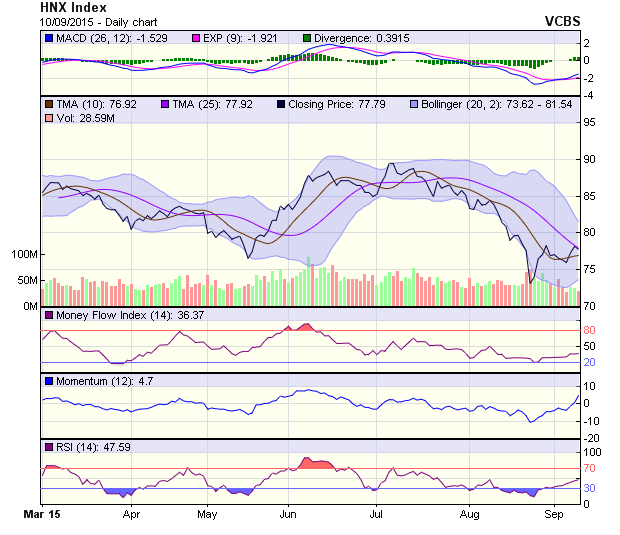 Mốc hỗ trợ ngắn hạn gần nhất quanh ngưỡng 76 điểm. Các chỉ báo kỹ thuật tiếp tục tăng, tuy vậy khối lượng giao dịch suy giảm khiến tín hiệu của chỉ số không đáng tin cậy tại thời điểm hiện tại.
