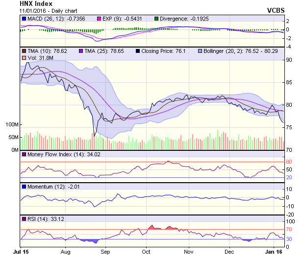 HNX-Index điều chỉnh giảm nhẹ với thanh khoản tiếp tục suy giảm. Chỉ số này đang kiểm định lại vùng tích lũy từ tháng 9/2015 tương ứng 75,6-78 điểm. Nhiều chỉ số kỹ thuật cũng đã về vùng quá bán, tuy nhiên quá trình giằng co dự kiến sẽ kéo dài thêm vài phiên nữa.