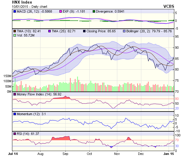 HNX-Index tăng mạnh trở lại trong phiên 9/1, chỉ sau một phiên giảm nhẹ. Đường giá xâm nhập vào vùng 85 điểm, khu vực kháng cự quan trọng được tạo lập bởi MA trung hạn. Việc “rung lắc” hoặc điều chỉnh có thể diễn ra trong một vài phiên tới. Dù vậy, xu hướng ngắn hạn của HNX-Index đã không còn là giảm và việc điều chỉnh (nếu có) là bình thường sau khi đường giá đã tăng tốt từ mức 80 điểm.