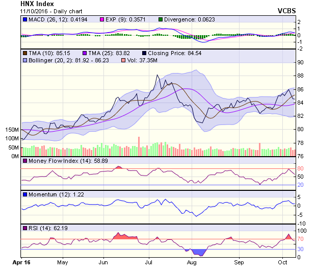 HNX-Index kết phiên với cây nến doji chân dài thể hiện sự giằng co dữ dội giữa lực mua và lực bán trong phiên ở mốc 84,5 điểm. Chỉ số đóng cửa ở dưới đường MA5 và MA nên tín hiệu trong ngắn hạn là trung tính. Trong trung hạn, tín hiệu của HNX-Index vẫn duy trì ở mức tích cực với ngưỡng hỗ trợ được tạo bởi đường MA20 ở mức 84 điểm. Kháng cự hiện tại của chỉ số đang ở mức 85 điểm, tương ứng với đường MA5 và MA10. Dự báo xu hướng của HNX-Index trong phiên 12/10 nhiều khả năng sẽ tiếp tục dao động trong vùng 84-85 điểm.