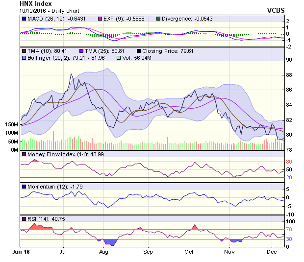 Chỉ số tiếp tục kết tuần dưới MA20 và MA50, nên HNX-Index tiếp tục ở trong thị trường giá xuống (bear market), với mốc kháng cự gần nhất tại 81,5 điểm (MA50). Dự đoán trong tuần này, HNX-Index có thể tăng nhẹ trở lại kiểm định vùng 80,9-81,5 điểm. Nếu chỉ số bứt phá được khỏi biên độ này thì xu hướng mới sẽ được hình thành.