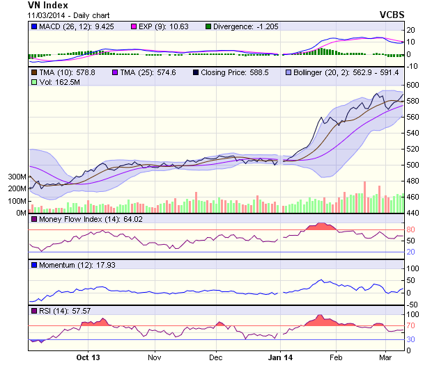 Có phiên tăng điểm thứ 5 liên tiếp, VN-Index tiến lên sát ngưỡng 590 điểm và chốt tại 588,5 điểm. Giao dịch trong phiên khá sôi động giúp cho thanh khoản đạt mức khá. Như vậy sau phiên giao dịch này VN-Index đã hoàn bù cho phiên giảm mạnh từ đầu tuần trước. Chỉ báo MACD tăng nhẹ trở lại, cùng các chỉ báo nhanh cũng phục hồi khá tốt. Trong vài phiên tới, áp lực bán ra ở vùng giá quanh 590 điểm sẽ tạo áp lực lên VN-Index.
