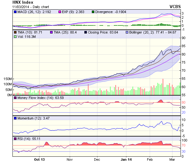 Vọt tăng lên 83,64 điểm với mức tăng 0,83 điểm, HNX-Index đã có chuỗi đà tăng 5 phiên liên tiếp. Cùng với đó HNX-Index đã quay trở lại vùng đỉnh cũ trong khoảng thời gian cuối tháng 2/2014. Hàng loạt chỉ báo ủng hộ xu thế phục hồi xuất hiện trên đồ thị kỹ thuật. Tuy nhiên, đường giá đang tiến khá sát dải trên Bollinger cùng áp lực bán ở vùng giá cao vẫn còn hiện hữu thì khả năng thị trường vẫn có thể tiếp tục giằng co trong ngắn hạn.