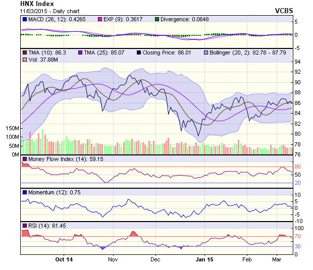 HNX-Index đã không thể có phiên tăng nhắc lại trong phiên 11/3. Pha điều chỉnh do đó vẫn còn duy trì hiệu lực. Đường giá một lần nữa lui về gần mốc hỗ trợ gần nhất tại 85,5 điểm. Kịch bản bảo về thành công vùng hỗ trợ này tiếp tục được chúng tôi đánh giá cao hơn. Ở chiều ngược lại, thử thách gần nhất dành cho đường giá duy trì tại mức 87,4 điểm.