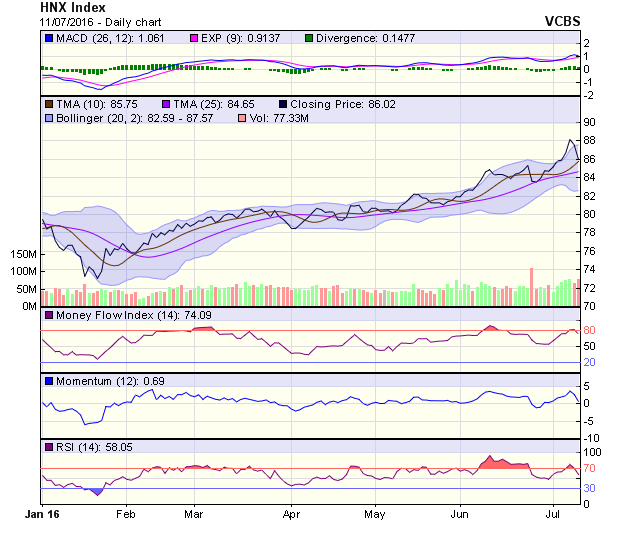 HNX-Index hình thành cây nến đỏ thân dài cho thấy áp lực bán bán mạnh của nhà đầu tư. RSI cắt xuống đường 70, MACD cũng cho tín hiệu suy yếu. Thanh khoản gia tăng. Rủi ro trong ngắn hạn xuất hiện trở lại. Vũng kháng cự 87 điểm. Vùng hỗ trợ 85 điểm.