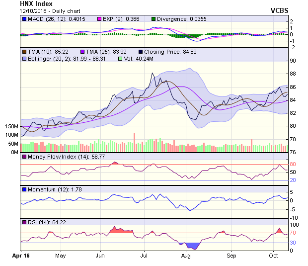HNX-Index kết phiên với cây nến xanh dạng búa ngược (inverted hammer) thể hiện lực bán mạnh tại ngưỡng kháng cự 85 điểm. Chỉ số đóng cửa ở dưới đường MA5 và MA10, nên tín hiệu trong ngắn hạn là trung tính. Trong trung hạn, tín hiệu của chỉ số vẫn duy trì ở mức tích cực với ngưỡng hỗ trợ được tạo bởi đường MA20 ở mức 84 điểm. Kháng cự hiện tại của chỉ số đang ở mức 85 điểm tương ứng với đường MA5 và MA10. Dự báo, xu hướng của HNX-Index trong phiên 13/10 có thể sẽ tiếp tục thử thách ngưỡng kháng cự 85 điểm, nếu thất bại, chỉ số sẽ dao động trong khoảng 84-85 điểm.