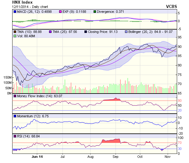 Trái ngược với diễn biến trên sàn HOSE, chỉ số HNX-Index bật tăng tới 1,27 điểm lên 91,13 điểm. Đây là phiên tăng điểm khá tích cực tính cho khoảng 1 tuần trở lại đây. Một cây nến xanh rỗng xuất hiện trên đồ thị kết hợp cùng việc chỉ số đã quay trở lại vùng đỉnh cũ từ đầu tháng 10/2014 là những tín hiệu khá sáng của phiên. Tuy nhiên thanh khoản thị trường cũng như dòng tiền cần được cải thiện tốt hơn để HNX-Index có thể bứt mạnh qua ngưỡng này.