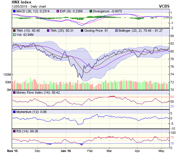 HNX-Index tăng điểm chạm mốc 81 điểm. Chỉ số hiên tại vẫn nằm dưới dải trên của Bollinger bands và tiếp tục giao dịch trong biên độ hẹp tại vùng 80-81 điểm. RSI và MACD cho tín hiệu tăng trở lại trong ngắn hạn. Ngưỡng kháng cự 81,5 điểm. Ngưỡng hỗ trợ 79,5 điểm.