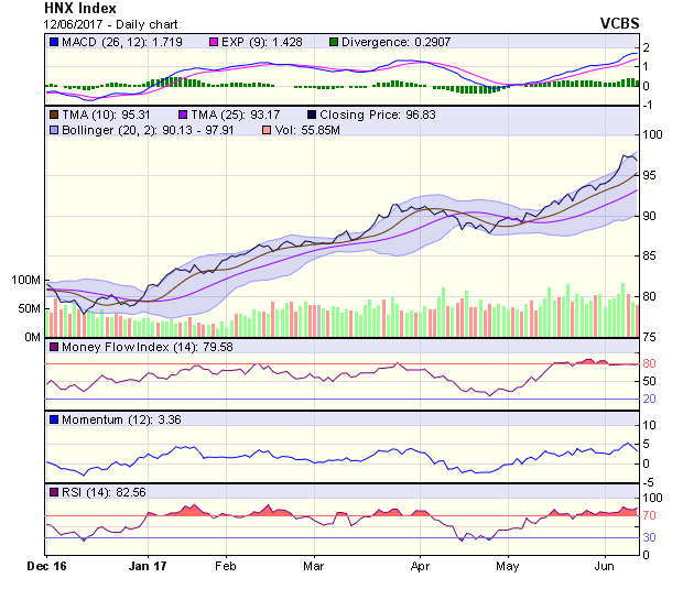 HNX-Index điều chỉnh trở lại, nhưng tín hiệu kỹ thuật ngắn hạn vẫn duy trì tích cực, với kháng cự và hỗ trợ gần nhất lần lượt tại 96,9 điểm (MA5) và 95,5 điểm (MA10). Dự báo, phiên 13/6, HNX-Index sẽ tiếp tục tích lũy đi ngang trong biên độ 95,5-96,9 điểm, chỉ số cần sự bứt phá ra khỏi mốc 96,9 điểm để xu hướng tăng tiếp tục.