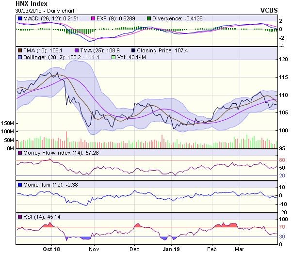 HNX-Index có diễn biến có phần tích cực hơn khi chỉ số đóng cửa tăng nhẹ quanh mốc tham chiếu nhưng vẫn tiếp tục duy trì đóng cửa dưới đường MA20, cho thấy chỉ số vẫn nằm trong một xu hướng điều chỉnh ngắn hạn, ngưỡng hỗ trợ gần nhất đang ở vùng 106 điểm (MA50).