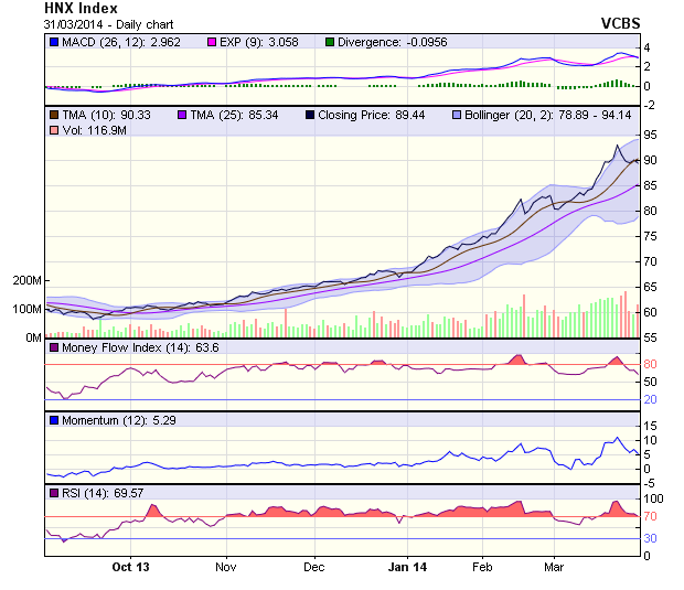 Chỉ báo kỹ thuật tiêu cực. MACD đã cắt  xuống bên dưới đường tín hiệu trong phiên 31/3, ủng hộ khả năng HNX-Index gián đoạn xu hướng tăng.