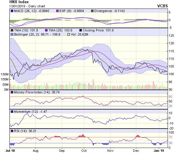 HNX-Index có diễn biến tương tự. Mặc dù, chỉ số có phiên tăng điểm trở lại nhưng vẫn đóng cửa dưới MA20, cho thấy xu hướng chính có thể vẫn là giảm điểm, phiên tăng điểm vừa qua có thể đang nằm trong nhịp phục hồi kỹ thuật, ngưỡng kháng cự cho nhịp phục hồi hiện tại có thể là vùng 103,2 điểm (MA20).