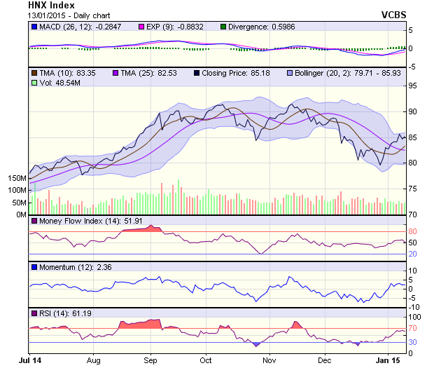 HNX-Index tăng mạnh trở lại trong 13/1, chỉ sau một phiên điều chỉnh. Đường giá một lần nữa xâm nhập vào vùng 85 điểm, khu vực kháng cự quan trọng được tạo lập bởi MA trung hạn. Việc “rung lắc” có thể diễn ra trong vài phiên tới. Dù vậy, xu hướng ngắn hạn của HNX-Index đã chuyển sang tăng và việc điều chỉnh (nếu có) là bình thường sau khi đường giá đã tăng tốt từ mức 80 điểm.