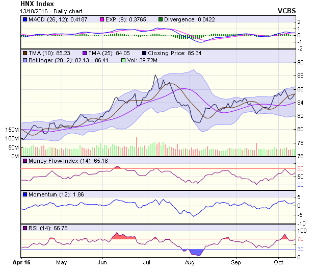 HNX-Index kết phiên với cây nến xanh và chân nến dài, thể hiện lực mua trong phiên đã chiến thắng lực bán ở vùng giá thấp. Chỉ số đóng cửa ở trên đường MA10 và MA5 cho tín hiệu trong ngắn hạn là tích cực. Trong trung hạn, tín hiệu của chỉ số được duy trì ở mức tích cực với ngưỡng hỗ trợ được tạo bởi đường MA20 ở mức 84,3 điểm. HNX-Index trong phiên 14/10 có thể kiểm tra lại mốc kháng cự gần nhất được tạo ra bởi đường MA10 ở mức 85,1 điểm, nếu mốc kháng cự này trụ vững, nhiều khả năng chỉ số sẽ tiếp tục tăng điểm tích cực.