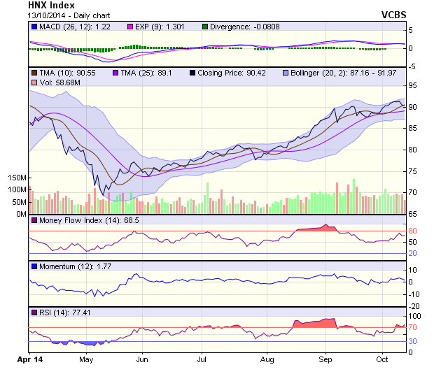 Hai chỉ số có thể tăng điểm với khối lượng giao dịch cải thiện trong phiên giao dịch ngày 14/10, đặc biệt lực cầu bắt đáy có dấu hiệu gia tăng trên nhóm cổ phiếu Midcaps và Smallcaps khi các nhóm cổ phiếu này đang trong trạng thái bị quá bán, cho nên chúng tôi đánh giá cao nhóm cổ phiếu Midcaps và Smallcaps có thể hồi phục trong phiên giao dịch này.