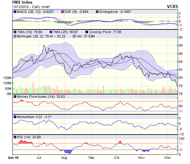 HNX-Index giảm điểm mạnh phiên thứ 2 liên tiếp, tạo thành nến đỏ lớn khá tiêu cực. Với phiên giảm điểm này, tín hiệu trong ngắn hạn vẫn là tiêu cực, với vùng kháng cự trong khoảng 79-79,8 điểm (MA5- 10). Tín hiệu trong trung hạn tiếp tục duy trì là tiêu cực, với kháng cự gần nhất tại 80,3 điểm (MA20).