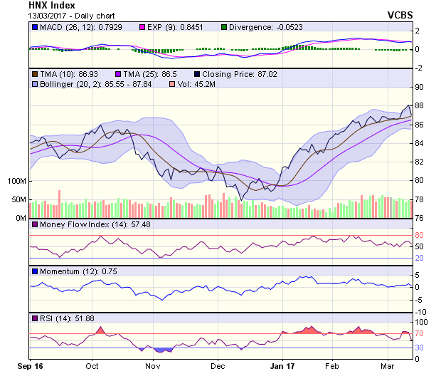 Dự báo phiên 14/3, HNX-Index có thể hồi phục trở lại với ngưỡng kháng cự tại 87,4 điểm và hỗ trợ tại 86,7 điểm.