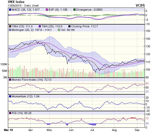 HNX-Index có diễn biến tương tự. Chỉ số có phiên tăng điểm thứ ba liên tiếp và duy trì đóng cửa trên MA 20, kèm theo khối lượng giao dịch gia tăng, cho thấy xu hướng phục hồi ngắn hạn có thể vẫn đang tiếp diễn, chỉ số có thể tiếp tục tiến lên thử thách ngưỡng 113,6 điểm.